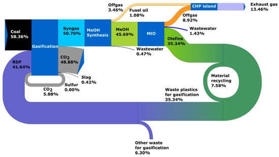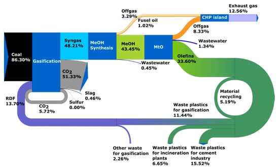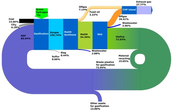 Recovered waste, including in particular waste plastics, is a valuable raw material in the gasification process. The produced synthesis gas is used to produce chemicals necessary for the functioning of the economy. For the purposes of this paper (study), the production of polyolefins through methanol (MtO: Methanol to Olefins) was adopted. In order to obtain the required level of production, additional coal must be supplied to the system. The amount of required coal depends on the level of raw material recycling of waste. In addition, hydrogen produced from renewable sources can be fed into the cycle. In this case, it is possible to reduce the CO2 emissions accompanying the production process to almost zero. The base technology—the central one, coupling the entire system—is the technology of gasification of solid fuels, including waste fuels.