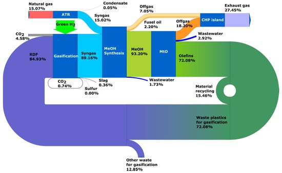 The use of the gasification process and then chemical synthesis to recreate the entire stream of recycled plastics requires an additional source of carbon element, e.g., in the form of fossil fuels []. This is due to the losses of the carbon element in the form of CO2, resulting from the need to obtain the appropriate gas composition required at the stage of chemical synthesis. Minimizing the loss of carbon, and consequently CO2 emissions, can be achieved by feeding the system with an appropriate amount of ‘green hydrogen’, produced using renewable energy sources. However, given the scale of production required, this is a technically feasible option in the medium-term.