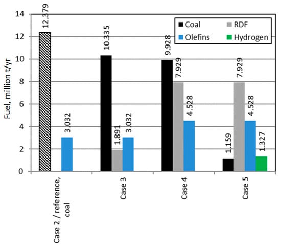 - Circular carbon economy, time horizon 2050—Case 4: olefins are produced from RDF waste and coal without ‘green hydrogen’ and the production volume covers the market demand. In this scenario, the amount of waste plastics available increases due to the increase in waste and the reduction in use for energy production (incinerators) and in the cement industry;