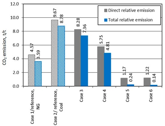 The use of ‘green hydrogen’, significantly reduces the hard coal consumption (Case 5, Table 9, Figure 13) and minimized the relative CO2 emissions (Figure 14). The addition of external ‘green hydrogen’ into the production system allows to obtain the required syngas composition without CO conversion unit (water-gas shift reaction) and the separation of excess CO2 (the main source of emission).