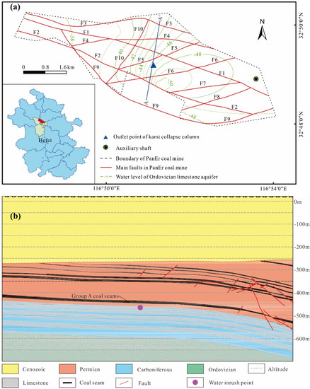 Karst collapse columns (KCCs) are special geological structures concealed in the limestone strata that are difficult to be found in the exploration before mining activities [1]. The KCC is usually filled with irregular rock blocks collapsed from the overlying strata, with an incomplete structure and developed cracks. Once the mining or excavation affects the KCC connected with the Ordovician limestone aquifer with strong water yield, the high-pressure groundwater penetrates the filling and dramatically flows along the fracture channel. More than 5000 KCCs have been found in 45 mining areas in the Northern China coalfield, mainly distributed in Shandong, Hebei, Shanxi, Anhui, and Henan provinces [2,3,4]. In recent years, with the increase in excavation depth, the water inrush disasters caused by KCCs have become more and more serious. This has aroused widespread concern, and some studies on the shape, water inrush mode, development, and seepage characteristics were carried out [5,6].