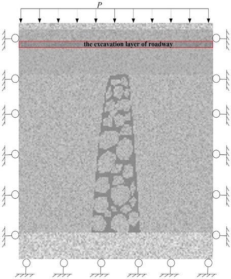 The established numerical model was 180 m in length and 250 m in height, consisting of 36,750 squares (grids 1 m × 1 m in size). The overburden weight was treated as a uniformly distributed load, which was exposed on the top of the model, while the bottom represented the Ordovician aquifers. The confined water pressure of Ordovician limestone was transferred and loaded to the model through the boundary of the underlying aquifer at the bottom of the model, and the whole model was subjected to the combined action of dead weight stress and Ordovician limestone water pressure vertically. Both sides of the model were horizontal displacement constraint boundaries, while the bottom was a vertical displacement constraint boundary. The value of confined water pressure was 2.5 MPa, and the fixed head boundary of 500 m high was set to simulate the Ordovician Limestone aquifers, as shown in Figure 4. The excavation step distance was set to 5.0 m.