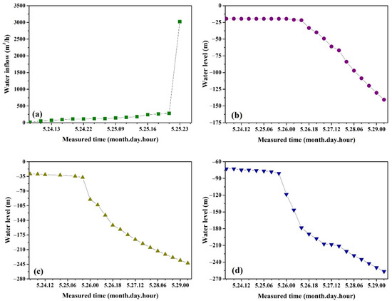 Furthermore, there were three ground holes monitoring the water level of the Ordovician limestone aquifers, namely, the Water Ⅱ-1 hole, V East-O2 hole, and Ⅵ West-O2 hole. The dynamic changes in groundwater level during water inrush from the roadway floor were monitored as shown in Figure 6b–d. As shown in the figure, the overall trend of groundwater level in the Ordovician limestone aquifer was relatively stable with no obvious decrease before 11:00 p.m. on 25 May. After that, the water level of V East-O2 and Ⅵ West-O2 observation holes decreased sharply, becoming 57.97 m and 43.67 m lower than the original water level, respectively. Then, the water level continued to decrease. Due to the good intraformational recharge of the Ordovician limestone aquifer, the water level of Water Ⅱ-1 did not decrease significantly before 12:00 p.m. on 26 May; however, subsequently, the water level decreased significantly. Corresponding to the development process of water inrush, the water level of Ordovician limestone aquifers also showed the characteristics of stage decline. The water level was relatively stable in the first and second stages. The water level showed a significant decline and a longer duration in the third stage.