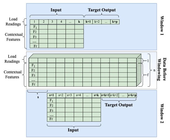 In the sliding window approach, as shown in Figure 2, the first input sample (Window 1) consists of the first k readings, thus one sample has a dimension of where n is the number of features. If predicting p steps ahead, the expected output contains load readings without contextual features at time steps to . Then, the window slides for s steps, the next input sample consists of readings from to , and the expected output contains load readings for time steps to . In this study, overlapping sliding widows are used, thus .