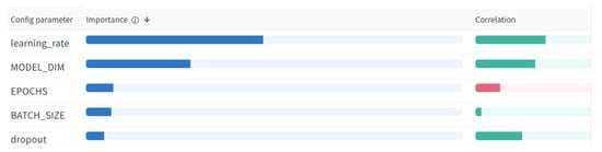 The transformer used in these experiments was made up of a stack of two encoders, two decoders, and two attention heads, and the feed-forward neural network in each encoder and decoder contained 512 neurons. The fully connected hidden layers of the transformer are those of the feed-forward networks embedded in the encoder and decoder; they use ReLU activation function. The Adam optimizer [] was used during training, with beta values of 0.9 and 0.98 and epsilon values of as suggested by Vaswani et al. []. The learning rate along with the transformer dropout [] rate used to prevent overfitting, the N-space dimension, and the batch size used to send data to the transformer were optimized using a Bayesian optimization approach on the Weights and Biases platform []. A total of 3477 runs were performed in order to identify the most relevant hyperparameters. Figure 4 shows the importance of each hyperparameter and whether or not it has a positive or negative correlation with optimizing loss.