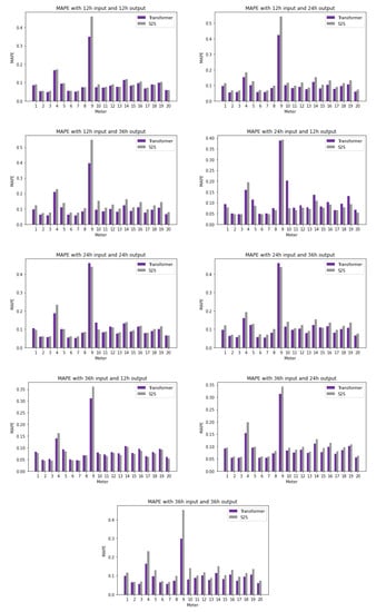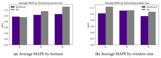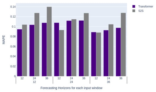 The average of all stream results for each of these experiments is shown in Figure 6. In this case, only MAPE is shown, as MAE and RMSE exhibit similar behavior. In Figure 6, we can make various observations such that the transformer performs much better than S2S [] when using a 12 h input window, but that the results are much closer when dealing with a 24 h input window. We can also see that regardless of the input size, the transformer outperforms S2S [] significantly when using a 36 h horizon.