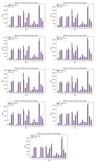 After looking at the detailed results of each experiment, we further investigated the average accuracy of each stream. The results are shown in Table 4. The average MAPE accuracy of each stream over all window sizes and horizons is 10.18% for transformers and 11.40% for S2S [], but it can be seen in Table 4 that it varies from 5.31% to 37.8%. The transformer’s MAPE for the majority of the zones is below 12%. The exceptions are Zones 4 and 9, which have higher errors; still, the transformer outperforms S2S [].