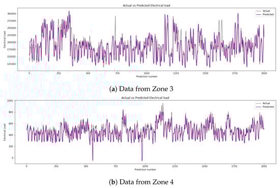 To visually illustrate the accuracy of the prediction results, the predicted and actual energy readings using a 36-step input and 36-step horizon for the streams for Zones 3, 4, and 9 are shown in Figure 13. The models shown have MAPEs of 0.05484, 0.1636, and 0.2975, respectively. The models appear to capture the variations quite well; however, lower values do appear to create some inconsistencies in prediction. These graphs only show a subset of the predicted test set but are able to showcase the differences across the various streams, such as differences in range, minimum and maximum values, and overall patterns of consumption.