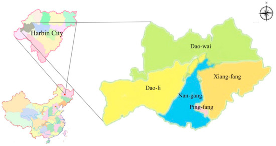 Harbin, the provincial capital of Heilongjiang, was chosen as the study area to analyze the multi-stakeholders’ integration of MSW management. Harbin is located in the northeast China and typically has severely cold winters for up to 5 months of the year [34]. The extreme operating conditions with a distinctive climate and an extremely cold winter make Harbin face unique challenges in MSW management systems. The exposed MSW freezes easily in winter, which makes the collection, transportation, and treatment processes far more difficult. The MSW transport vehicles face the risk of skidding in the frozen ground in winter. Moreover, MSW transportation distances are long due to the low population density in Harbin, contributing to high MSW transportation costs. The integration of these conditions makes Harbin distinct from other parts of China. A case study in Harbin, China, can provide theoretical insights and practical guidelines for authorities that want to achieve sustainable MSW management goals. Specially, it can provide a scientific reference for improving stakeholder engagement and guide the coordinated development of integrated MSW management in comparable northern regions associated with severely cold region characteristics. Therefore, there is of theoretical and practical meaning to deeply study the integrated MSW management in Harbin city, combined with its region characteristics. Figure 1 shows the study area in this paper, including five districts in Harbin, namely Nan-gang District, Dao-li District, Dao-wai District, Xiang-fang District, and Ping-fang District.