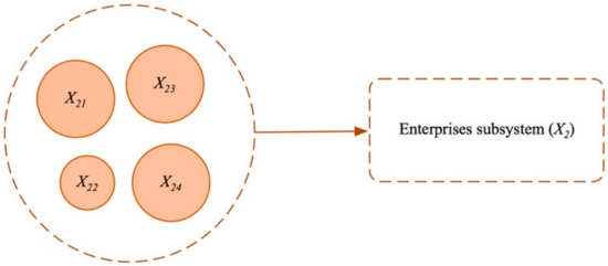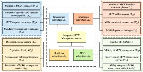 - Enterprises subsystem. Enterprises are core MSW management stakeholders, especially under the vigorous development of MSW incineration power generation projects by the Chinese government. The number of MSW treatment plants to reduce harmfulness and MSW treatment rate can measure enterprise treatment capacity with respect to integrated MSW management [42], and the MSW collection area is the key indicator of cleanliness in the improvement of MSW treatment infrastructure and the realization of the treatment of harmful MSW. To take advantage of recycling and reuse capabilities, MSW disposal technologies act as keys to integrated MSW management systems and should thus be included in the process of upgrading facilities or services [43]. Therefore, these evaluation indicators are essential for analyzing enterprise engagement in integrated MSW management.