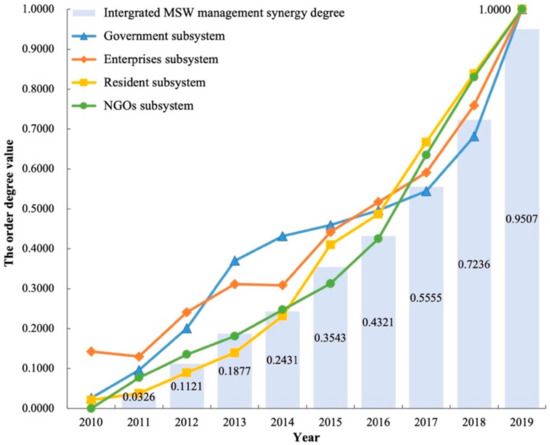 The order degrees and the weights for the evaluation indicators in the integrated MSW management subsystems from 2010 to 2019 can be determined based on Equations (1), (3) and (4). The subsystem order degrees and the integrated MSW management system synergy degree can be determined based on Equations (2), (5) and (6). The evolutionary trend of each subsystem and the overall system is shown in Figure 3.