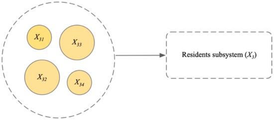 From Figure 3, the order degree of residents subsystem was positive and there was an obvious rising trend during the observation period, the rate of the rise increased remarkably over the years, and the order degree achieved a peak of 1.0000 in 2019. Overall, the interactive relationship of the population density (X32) and activeness of public participation (X33) greatly promoted the synergetic evolution of the residents subsystem (Figure 6).