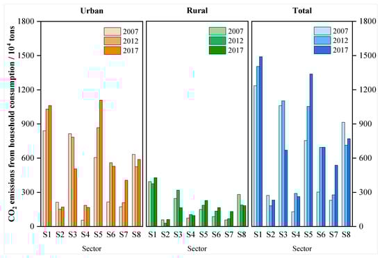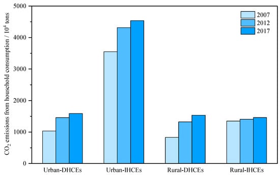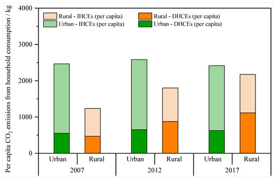 The per capita HCEs of urban residents (2416.88 kg CO2) was higher than that of rural residents (2173.05 kg CO2) in 2017 (Figure 4). The urban per capita HCEs has a downward trend in recent years, while the rural per capita HCEs has steadily increased, thus demonstrating a narrowing difference between urban and rural per capita HCEs in Fujian province.