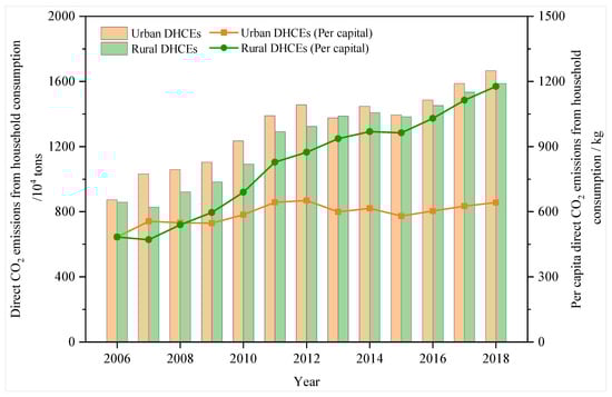 The DHCEs increased continuously with fluctuation yearly in urban and rural areas (Figure 5). The DHCEs of urban areas in 2018 were 1.91 times that of 2006, and those of rural areas increased 1.85 times from 2006 to 2018. In addition, the urban DHCEs (1666.24 kg) came close to the rural DHCEs (1587.18 kg) in 2018. The per capita DHCEs of rural residents have exceeded those of urban areas since 2009, demonstrating a widening gap. Combined with Figure 2 and Figure 5, per capita carbon emissions still increased despite the decline in rural population, while the urban population increased without demonstrating notable per capita DHCEs changes.