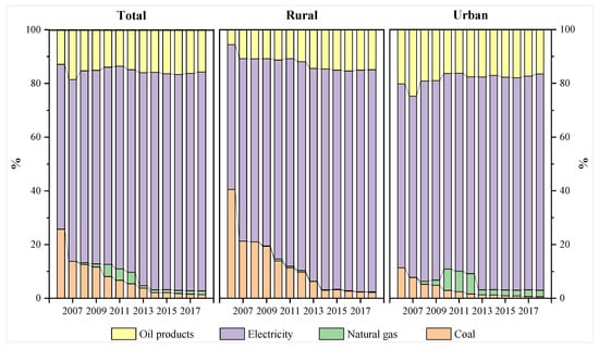 Furthermore, the energy structure of the DHCEs in Fujian province is identified and compared. Electricity accounted for the largest proportion of the DHCEs, rising from 61.34% in 2006 to 81.55% in 2018 (Figure 6). Oil products followed such a trend, with an average proportion of 15.48%. Since 2008, natural gas has been used in residential energy consumption in Fujian province. As a clean and commercial primary energy, natural gas contributes a small proportion of CO2 emissions (1.37% in 2018). Notably, natural gas is currently used in urban areas and is less employed in rural areas. Coal is the only energy source that decreased from 2006 (25.76%) to 2018 (1.34%). This reduction is inseparable from the sharp decline of the rural areas, that is, from 40.47% in 2006 to 2.16% in 2018. Clean energy has been promoted and applied in recent years. Thus, the energy structures of the DHCEs in both urban and rural areas of Fujian province have generally been optimized.