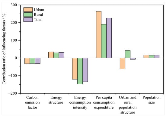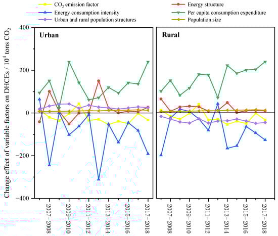 The change in the urban–rural structure of the population positively and negatively contributes to the DHCEs of living consumption of urban residents and the rural areas, respectively, ultimately resulting in a slightly negative overall effect.