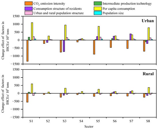 Considering the change effects of all factors in each sector, the changes in carbon emission intensity of all sectors presented negative effects, while per capita consumption and population size demonstrated positive effects on all sectors of rural and urban areas.
