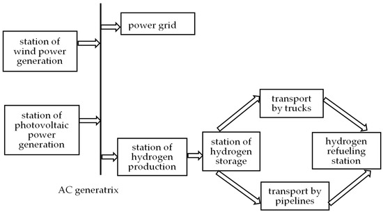 At present, the main methods to produce hydrogen include thermochemical methods, natural gas reforming methods, coal gasification, steam methane reforming and water electrolysis [26], so there are more and more studies on hydrogen production systems [27,28,29]. In the Wind H2 plan which is proposed by the National Renewable Energy Laboratory (NREL) of the United States, the wind–hydrogen coupled system adopts electrolysis of water to produce hydrogen which is also adopted by other countries in hydrogen storage systems for the wind–solar power generation. That is because hydrogen production by water electrolysis has the advantages of simple operation, high hydrogen production efficiency and little environmental pollution. In recent years, it has been a useful way for hydrogen storage and hydrogen energy development to use hydrogen as secondary energy or fuel for industrial applications which is produced by abandoning water, wind and solar power.