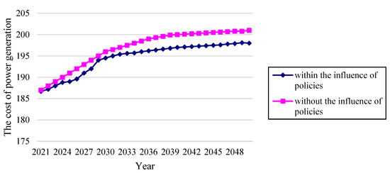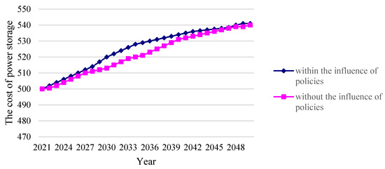 The cost of hydrogen storage is influenced by the policy as shown in Figure 9. Hydrogen is explosive so no subsidies are offered for hydrogen storage. On this basis, the cost of hydrogen storage is higher. The cost of hydrogen storage in 2030–2040 is high due to the large amount of hydrogen production. In order to effectively allocate hydrogen, the number of hydrogen storage stations increases, the amount of hydrogen storage increases and the cost of hydrogen storage is high in 2030–2040.