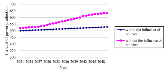 In the cost of power generation, the unit cost of power generation and the amount of power generation (mainly affected by the amount of hydrogen demand) are greatly affected by the policy. The amount of demand is generally determined by market supply and demand, while the unit cost of power generation depends on the government’s subsidies. Figure 6 below shows the influence of policies on the unit cost of power generation by wind and photovoltaic power plants. Since 2019, China has decreased subsidies for wind and photovoltaic power plants. Due to the stability of power generation by photovoltaic power plants, places with rich wind and solar energy are encouraged to build photovoltaic power plants. Based on the previous analysis, the amount of photovoltaic power plants will increase from 2021 to 2030. Affected by the scale effect, the cost of power generation by wind and photovoltaic power plants will decrease and will stabilize after 2030.