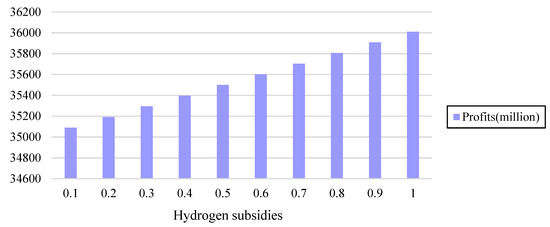 Figure 10 explores the changes in profits in the system corresponding to the degree of national support for hydrogen subsidies. This paper takes the influence of different hydrogen subsidies (0.1–1 yuan/m3) on the economy of hydrogen storage systems for wind and photovoltaic power generation into consideration. Figure 10 shows that the different hydrogen subsidies change profits in the system. Therefore, when applying the hydrogen storage system for wind and photovoltaic power generation throughout the world in the future, the hydrogen subsidies should be increased. Nowadays, hydrogen refueling stations at the hydrogen demand end are always subsidized by China. Therefore, in future, more hydrogen subsidies should be offered to stations of hydrogen production and storage, which will make the system more economical.
