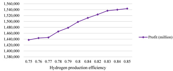 The progress of system technology is represented by replacing old technology with advanced technology, and producing products with higher efficiency and better output. Technological progress mainly affects technical parameters in the model, including hydrogen production efficiency of hydrogen production equipment, rated gas weight of trucks, rated power amount of transmission lines and loss of power transport. Technological progress will improve the efficiency of hydrogen production by using hydrogen storage systems for wind and photovoltaic power generation. Figure 11 below shows the influence of different hydrogen production efficiencies on profits.