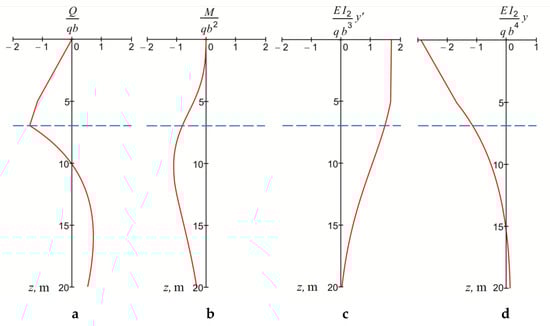 According to the results of Equations (8)–(10), the distribution of the transverse force, bending moment, angle of rotation and lateral displacement were studied (Figure 4). The graphical results of the force and deformation analysis of the interaction of underground structures of a borehole with a soil body are presented in a dimensionless form, since in this case one solved dimensionless option corresponds to a whole group of possible dimensional problems. Therefore, in Figure 4, going from left to right, we have: the results of the force analysis—the distribution of the shear force (Figure 4a) and the distribution of the bending moment (Figure 4b) along the length of the underground well structure; the results of the deformation analysis—the distribution of the angles of rotation of the cross sections of the system (Figure 4c) and the distribution of transverse displacements (Figure 4d). The transverse force is equal to zero on the daylight surface, as a whole it changes nonmonotonically, changes symbol once and has a kink in the area of the slickenside. The bending moment behaves nonmonotonically and has an extremum outside the slickenside. The rotation angle graph has linear and non-linear sections, which are associated with the design feature of the underground part of the well. The angles of rotation over the entire interval of the study retain a constant symbol, which determines the interval of monotonous change in the graph of transverse displacements of the underground structure of the well. The maximum values of the angle of rotation and transverse displacements are reached on the daylight surface.