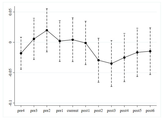 It is necessary to test parallel trends for an independent variable between the experimental and the control groups before the policy [38]. Referring to Jacobson et al. (1993) [39], we adopted the event study method to examine parallel trends. We conducted the interaction items of year dummy and Treat. The regression results for each interaction item, including coefficients and confidence intervals, are given in Figure 1. The results show that the coefficients of interaction items before 2013 are insignificant, indicating the parallel trend assumption is fulfilled.