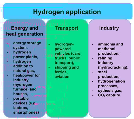 Hydrogen shows potential for use in various sectors (Figure 1) [,]. Today, gas is used in industrial processes (refining, chemistry, steel production), fertilizers production, cooling in power plants, semiconductor manufacturing, and food processing. Metal hydride batteries are already used as batteries in electronic devices (e.g., laptops). Due to the high consumption of fossil fuels and increasing environmental awareness, hydrogen is currently considered as the most promising fuel for the future. It is considered that sooner rather than later, hydrogen will be used for supplying electricity and heat to residents as well as in transportation (road, water, and air), with little or no environmental impact, both locally and globally.