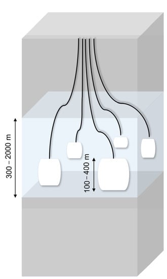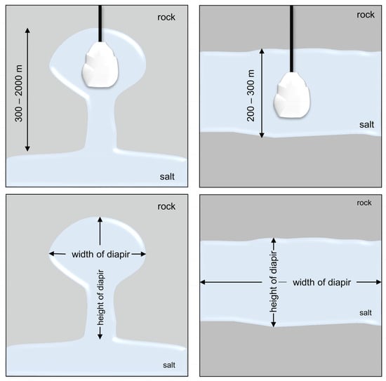 Diapir deposits are in the form of chimneys, fungi, and vertical dips, the width of which is usually less than the height. These deposits can be up to 6 km thick []. On the other hand, layered deposits are characterized by a large horizontal length and a relatively small thickness compared to diapyrous deposits. The thickness of such a deposit ranges from about 200 to 300 m (Figure 1) []. The thickness of the salt caverns allows for the boring of large-capacity tanks. On the other hand, the width, as in the case of layered beds, allows for drilling several tanks next to each other.