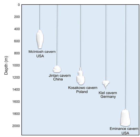 Salt caves are also very promising because of the ability to adjust the size and shape of the caverns that results from the large thickness of the salt deposits [,]. An example of different shapes of salt caverns found in different places across the world is presented in Figure 3. The final shape of the cavern depends on many factors, among which technology of the mining process, depth of cavern location, type of salt deposit (bedded or domal), and the mineralogy of rock salts and interlayers serve as examples []. Numerical modeling methods can be very useful in the design of cavern shape, ensuring stability under the given geological and mining conditions. However, applied models are idealized and projected by geometrical solids and do not always reflect the actual shape obtained in the leaching process []. When the direct leaching method for cavern construction is applied, cylindrical caverns are usually formed. Under indirect (reverse) leaching, a shape with an enlarged top is mostly obtained []. An important issue is also the type of salt deposit. Salt structures formed by halokinesis can form salt pillows (up to several hundred meters high) or salt domes (up to several kilometers high). The internal structure of the latter is very complex, so it is crucial to analyze them in order to correctly select the salt massif for the construction of storage caverns []. Rock salt has favorable physical and chemical properties for hydrogen storage. The walls of a salt cavern are impermeable to hydrogen and chemically inert, while the low permeability, high compressive strength and ductility of rock salt help in the healing of microcracks formed during high-pressure operations. The high thickness of salt deposits, on the other hand, provides space for the construction of large-capacity underground tanks. The properties of salt guarantee the tightness of the repository and long-term dynamic stability [,]. Salt domes are characterized by large and homogenous mass, making the design of the cavern shape and size easier []. In these deposits, a vertical cylinder cavern shape is preferred with several hundred meters of height and a diameter of 50–80 m. The volume of such caverns is from 300,000 to 700,000 m3 []. In bedded salt deposits characterized by thinner salt beds (100–300 m), the volume of caverns can be maximized by a diameter-to-height ratio with a minimum value defined as 2:1 ensuring geo-mechanical stability []. The typical volume of such caverns is in the range 100,000–300,000 m3 []. The presence of more or less soluble interlayers (such as K-Mg salts or anhydrite, respectively) in the deposit results in irregularities of the cavern shape. In the bedded salt deposits with less soluble interlayers, there is a tendency to create bevels, ledges, “necks”, or “waists”. For example, in the Jintan formation (China) interlayers of silt mudstone and silt sandstone are present [].