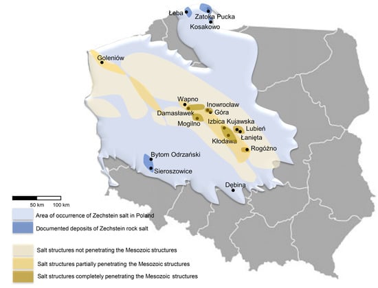 Taking the above into consideration, the most promising deposits for the construction of underground storage caverns in Poland seem to be Rogóźno, Damasławek, Lubień, Łanięta (diapiric deposits), Goleniów, and Izbice Kujawska []. However, around salt rock deposits in Rogóźno, there are unfavorable hydrogeological conditions (the presence of many aquifer horizons in the surrounding of the dome and in the cap rock) []. The Dębina dome is not considered a useful site for underground storage due to the close location of the Bełchatów coal mine. As a consequence of decades of lignite extraction, the uncontrolled process of salt mobilization or leaching is possible. Cavern construction in this deposit can be risky. The most promising warehouse area in Poland, according to Czapowski [], is also a coastal belt of Poland. These are mainly areas from Białogóra through Dębki, Żarnowiec, Karwie, Puck and the area of Łeba. The conducted research has shown that in these regions, there are optimal conditions for the formation of salt caverns. The location by the Baltic Sea provides an easy disposal of leached brine. The potential is also shown by other regions of the Fore-Sudetic Monocline (Nowa Sól, Bytom Odrzański, Przyborowa) [,]. Lankof and Tarkowski [] also assessed the high storage potential in the town of Gubin located in the region of south-western Poland. The deposits located in PZ2-PZ4 cyclothem (such as in Legnica-Głogów area) are unsuitable for cavern construction due to possible gas leaching through potassium salt interlayers.
