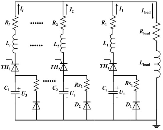 As shown in Figure 2, the circuit topology consists of several pulsed forming units (PFUs), including the capacitor Ci, the thyristor switch THi, the current limiter Li, and the freewheeling diode. Ri is the resistance of the current limiter, Di is the freewheeling diode, Rsi is the on-resistance of Di, Rload and Lload are the respective equivalent resistance and the inductance of the railgun, and Ii is the current supplied by the i-th PFU. Line resistance and line inductance are considered by adjusting the magnitude of Li, Ri, and Rsi. During the working process of the circuit, the high voltage charger is firstly used to charge i-th PFU to a high voltage Ui, and then the thyristor THi will receive the trigger signal and conduct at the moment ti. In this way, the sequence discharge of the capacitive PPS is achieved.