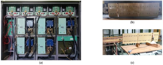 To verify the effectiveness of the mathematical models, three groups of experiments were carried out. In the experiment, the PPS consists of 10 capacitive PFUs, the load consists of two copper bars and a steel semicircle to simulate the railgun. The load current is measured by the Rogowski coil. Besides, based on MATLAB, the mathematical model is developed and run with the same charging voltage configuration and sequence for the experiment. Finally, the comparation is made between the calculations and experimental result, and the difference is analyzed. The experiment devices are shown in Figure 4.