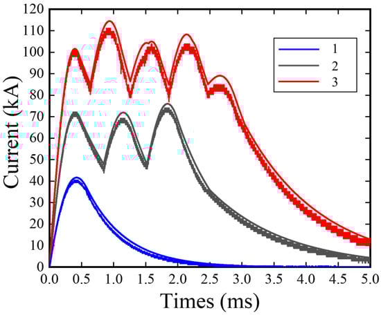 According to Figure 5, with the charging voltage configuration and sequence shown in Table 2, the calculations and the experimental result are basically consistent; however, the former has stronger current. There are two possible reasons. Firstly, the charging process will be automatically cut off when the maximum voltage of the capacitor bank exceeds the set value, since the charging speed of each capacitive PFU is different slightly, the actual energy charged is smaller than the set value. Secondly, the load resistance and inductance are both measured by the RLC instrument under static conditions and affected by the current skin effect, so the actual resistance will be larger in experiment.