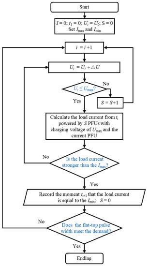 In Figure 6, i is the stage number of PFU and Imax and Imin form the oscillation range of the flat-top current; the smaller the oscillation range, the stabler the current. The flat-top pulse width (FTPD) is defined as the time interval from the first moment that the load current is equal to the flat-top current to the last moment that the load current is equal to the flat-top current. Besides, U0 is the initial iteration value of the charging voltage, ΔU is the iteration step, and Umax is the maximum charging voltage allowed for the PFU. As an intermediate parameter, S is introduced to calculate the number of PFUs discharging simultaneously. The mathematical model is developed based on Equation (4) and Figure 6, and automatic assignment of the trigger sequence and charging voltage optimization is achieved.