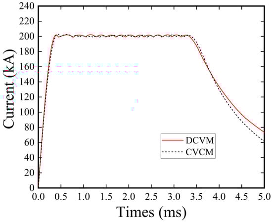 As shown in Table 3, with the CVCM, the total PFU adopted in Liu’s model is 47, and all PFUs are charged to 2836 V. Compared with the maximum charging voltage, the actual charging voltage is very small, so 12 PFUs have to discharge simultaneously to meet the flat-top current magnitude demand of 200 kA. Two PFUs are required to keep the flat-top current in each pulse during the platform. However, the charging voltage of the first three PFUs is so high in terms of the DVCM that the flat-top current magnitude demand can be met with the three. Besides, other PFUs are charged to appropriate voltage individually according to Imax, so a single PFU is enough to keep the current in each pulse during the platform. The contrast curve of current obtained with the two charging methods is shown in Figure 7.