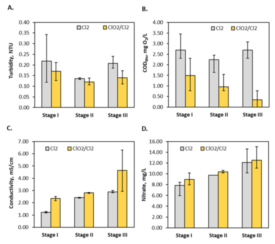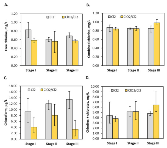 - Werdehoff, K.; Singer, P. Chlorine dioxide effects on THMFP, TOXFP, and the formation of inorganic by-products. J. Am. Water Work. Assoc. 1987, 79, 107–113. [Google Scholar] [CrossRef]