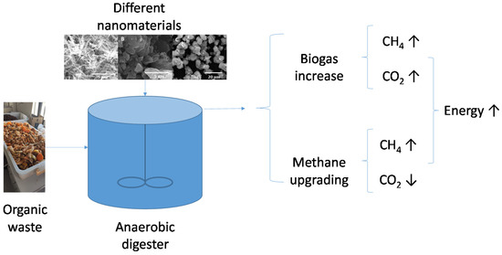After these studies, numerous works dealing with AD and NPs have been reported. What are these beneficial effects of nanomaterials on anaerobic digestion? The general response is the increase in biogas, that is, methane production. However, this simple asseveration should be clarified, as it can be somehow confusing. For instance, it is well known that other additives, such as biochar, increase the production of biogas [8]. However, the effect of nanomaterials can be detected on different parameters of the anaerobic digestion process. On the one hand, most studies published in the batch mode report significant increases in biogas production, which is the typical way to interpret this effect [9,10]. However, several recent studies carried out in the continuous mode reported a similar production of biogas, with this biogas being considerably enriched in methane content when some NPs were added [11,12]. In times of a worldwide energy crisis, this result is particular interesting, as it supposes an in situ biogas upgrading (i.e., methane enrichment) that makes this renewable energy closer to the natural gas produced or obtained from fossil fuels. In fact, biogas upgrading is one emerging area of applied research for achieving ready-to-use methane, using several technologies that have severe economic restrictions [13,14]. Figure 1 explains these two different benefits.