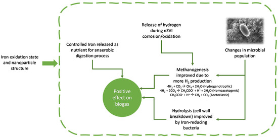 It is also hypothesized that the state of oxidation of iron NPs is a key parameter for biogas or methane increase. Some studies dealing with wastewater sludge [11] and pig manure [12], studied in detail in the oxidation state, highlighted the iron state of oxidation as a promoter for increasing methane in anaerobic digestion. A schematic drawing of the mechanisms of enhancement is presented in Figure 2.