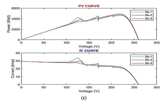 The results are shown in Figure 4 and Figure 5, respectively. Figure 5c also shows examples of data points for the calculation of “m”. Significant behavioral changes in characteristic curves of PV arrays arranged in two different test scenarios are concluded as follows: