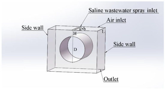 We use the same physical model as the experimental setup of Parken [24] to compare the results of the numerical simulations with the experimental results. Figure 1 shows a three-dimensional view of the computational domain and its dimensions. The scale parameters of the model are set in Table 1. The boundary conditions are listed in Table 2. The salty effluent is simulated using sodium sulfate-water mixture with different content of sodium sulfate instead. For the investigation of the effects of heat flux, spray density, spray temperature, and salinity on heat transfer, different parameters were set at different degrees, as shown in Table 3.