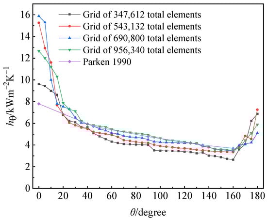 The structured grids with numbers 347,612, 543,132, 690,800, and 956,340 are selected and compared, which is used to examine the numerical method’s dependence on the grid. Figure 2 shows the comparison of local heat transfer coefficients between simulations and experimental studies [24] for different mesh numbers. As seen, when the grid number increases from 347,612 to 690,800, the heat transfer coefficient undergoes significant variation, while the heat transfer coefficient shows little change when the grid number increases from 690,800 to 956,340. This indicates that a grid number higher than 690,800 has little effect on the simulation results. Finally, the grid with the number 690,800 is applied in the next research.