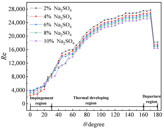 From Figure 3, It can be found that the variation of the local Reynolds number with different Na2SO4 content is small, and the Reθ is not greatly influenced by fluid viscous force because of the formation of the thicker liquid film outside the tube in the impingement region. In the thermal developing region, as the salt concentration of the effluent increases, the viscous force on the fluid increases, the flow rate around the tube decreases, and Reθ gradually decreases. In the departure region, on one hand, due to the accumulation of a large amount of effluent, the fluid film outside the horizontal tube thickens and the flow velocity around the tube drops sharply. As well, the minimum flow velocity of effluent appears with a salt concentration of 10%. On the other hand, due to the strong disturbance formed by the vortex effect, the difference in the velocity is smaller. The variation of the local Weber number is basically the same as the local Reynolds number.