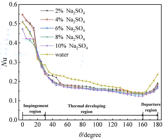 With the increase in concentration, the trend of Nuθ is shown in Figure 4. Compared to pure water solution, the partial elevation of salt content in the solution can enhance the solution perturbation of the impaction process in the impingement region, thus enhancing the heat transfer. However, as the salt content increases further, the viscosity gradually plays a key role, leading to a deterioration of heat transfer relative to pure water. The local Nusselt number decreases in the thermal developing region as the salt concentration of effluent increases, which is because of the various viscosity resulting in various flow velocities around the tube. In the departure region, Nuθ is the lowest for effluent with a salt concentration of 10%, and the difference is small due to the strong turbulence formed by the vortex. In the other two regions, the viscosity of the salty solution plays a dominant role relative to pure water, reducing the flow rate around the tube and leading to a thicker liquid film and a lower Nuθ.