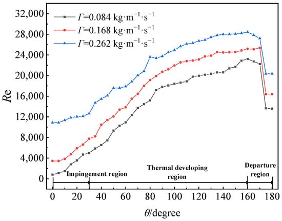 From Figure 5. The Reynolds number of the liquid film flow grows as the spray density grows. This is the fact that higher spray density causes greater inertia and more turbulence in the liquid film flow, and higher spray density causes greater turbulence in the impingement and departure region. Hence, the slope of the Reθ curve is larger and the velocity changes drastically in these two regions. In the thermal developing region, the liquid film flow velocity gradually increases and the liquid film thickness gradually declines due to the effect of gravity. However, with increasing spray density, the liquid film thickness gradually enlarges and the growth of liquid film flow velocity gradually becomes slower, which partially offsets the positive impact of inertia force. The variation of the local Weber number is the same as the local Reynolds number.