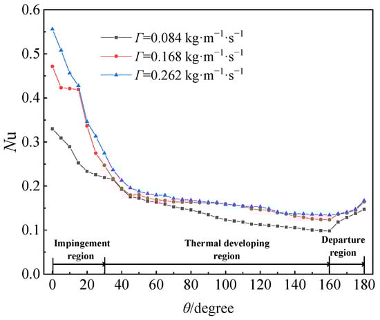 The impact of spray density on the local Nusselt number is shown in Figure 6, it can be seen that Nuθ increases when the spray density increases from 0.084 kg·m−1·s−1 to 0.168 kg·m−1·s−1. This is due to the fact that with increasing spray density, the flow rate of the liquid film increases, thus promoting heat transfer. The influence of spray density is even more noticeable in the impingement region. Because the increase in velocity results in enhanced fluid mixing inside the liquid film at the top of the tube. However, Nuθ changes slightly when the spray density increases from 0.168 kg·m−1·s−1 to 0.262 kg·m−1·s−1. The higher spray density leads to an increase in film thickness, which increases the thermal resistance of heat conduction between the wall and the liquid film, which is detrimental to heat transfer and offsets the positive effect of velocity.