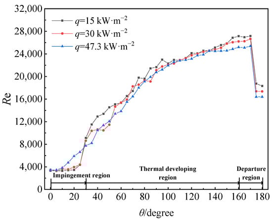As shown in Figure 7, the local Reynolds number is not greatly affected by the heat flux. It is observed that in the impingement region, the velocity gradient within the velocity boundary layer under the large heat flux condition is larger, thus strengthening the intensity of the vortex disturbance in this region. In the other two regions, with the increase of heat flux, on one hand, the liquid thermal properties do not change. On the other hand, the liquid velocity does not change much. Therefore, Reθ does not change much, the basic variation trend of which is consistent with other conditions. Also, the change of the local Weber number is the same as the local Reynolds number.