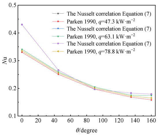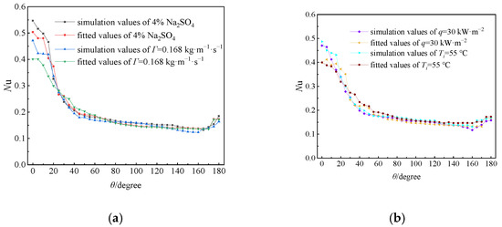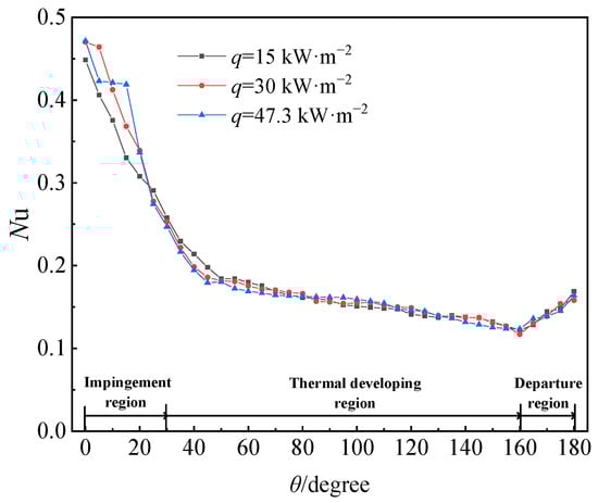 The local Nusselt number of mixed solutions drop film flow with different heat fluxes is shown in Figure 8. At the top of the tube, Nuθ is found to increase with increasing heat flux. This is because of the increased temperature gradient in the thermal boundary layer caused by the impact, which results in buoyancy effects and density differences. With the increased heat flux, natural convection in the radial direction is enhanced, resulting in the increase of Nuθ [26]. At the bottom of the tube, the impact effect disappears, and heat transfer by forced convection becomes dominant. The local Nusselt number is usually independent of the heat flux [24]. Therefore, in the thermal developing region, the heat flux does not seem to have a significant effect on Nuθ.
