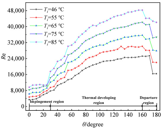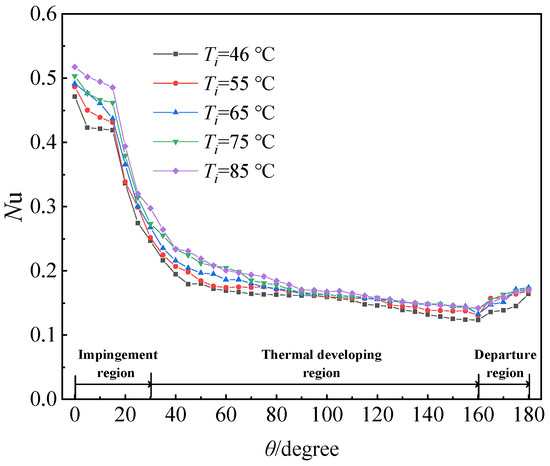 When the circumferential angle is 0–30°, the first region is called the impingement region. The second region (30–160°) is called the thermal developing region, and the third region (160–180°) is called the departure region [21].